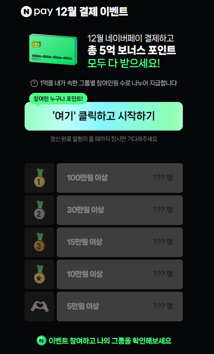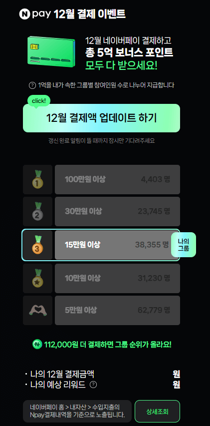 12월 결제액을 업데이트하면, 자신이 속한 그룹이 나타납니다. 그룹은 총 5개이고 자기가 속한 그룹에 따라 1억을 나누어 가지게 됩니다. 즉, 총 5개의 그룹이 있기 때문에 5억의 상금이 지급되는 것입니다.