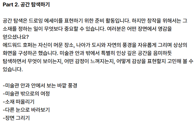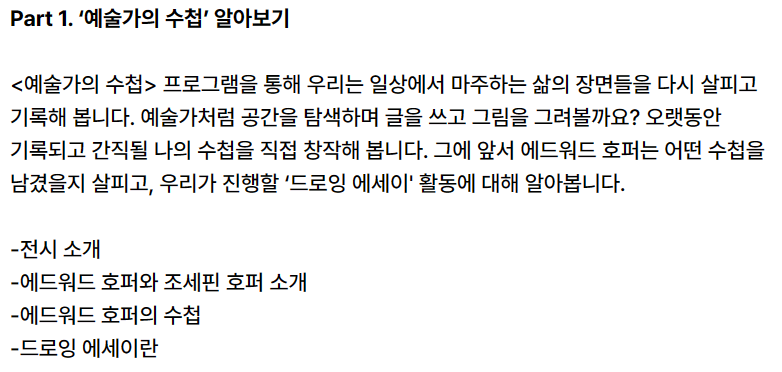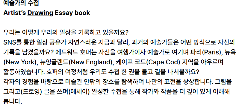 | 1. 예술가처럼 생각하기를 실천하는 창작 워크숍 <예술가의 수첩>은 에드워드 호퍼와 그의 아내 조세핀 호퍼가 기록한 장부(Artist's ledger - Book II, 1907–1962)에서 영감을 얻어, ‘드로잉 에세이’를 주제로 교육을 진행함. 2. 파리, 뉴욕, 뉴잉글랜드, 케이프코드 지역을 아우르며 활동하였던 여행가이자 예술가였던 에드워드 호퍼의 삶의 여정처럼 참여자는 각자의 경험을 바탕으로 미술관 안팎의 장소를 탐색하며 그림을 그리고(드로잉) 글을 쓰며(에세이) 완성한 수첩을 통해 작가와 작품을 더 깊이 있게 이해해 봄. |