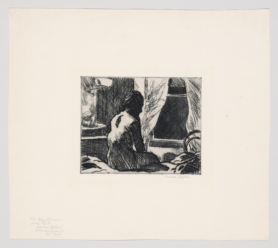 1882년 뉴욕에서 태어난 호퍼는 그림과 문학을 즐기며 성장했습니다. 1906년 뉴욕에서 삽화가로 일을 시작한 호퍼는 예술의 수도로 알려진 파리로 가서 활동합니다. 세 번의 유럽 방문을 마친 후 뉴욕에 정착한 호퍼는 드로잉처럼 선이 강조되는 판화기법 에칭을 1915년에 시도하게 됩니다. 1967년까지 평생을 뉴욕에 거처하며, 뉴욕의 풍경과 뉴요커들의 일상을 관찰하며 작업의 소재로 삼았습니다. 20세기 초 뉴욕은 오늘날과 같은 '메트로폴리스로서의 뉴욕'으로 변모하던 시기로 마천루가 형성되고 지하철과 철도에 이어 자동차 보급의 확산, 다리와 고속도로가 잇따라 건설되었습니다. 하지만 호퍼의 관심은 사람들이 북적이는 도시 풍경보다 낡고 사라져 가는 19세기 건축물의 코너나 지붕이었습니다. 이렇게 당시 화가들과는 차별화되는 감각을 선보입니다.
