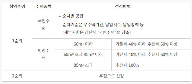- 청약순위(1,2순위)에 따라 입주자를 선정하며 1순위 미달 시에만 2순위 입주자를 선정합니다