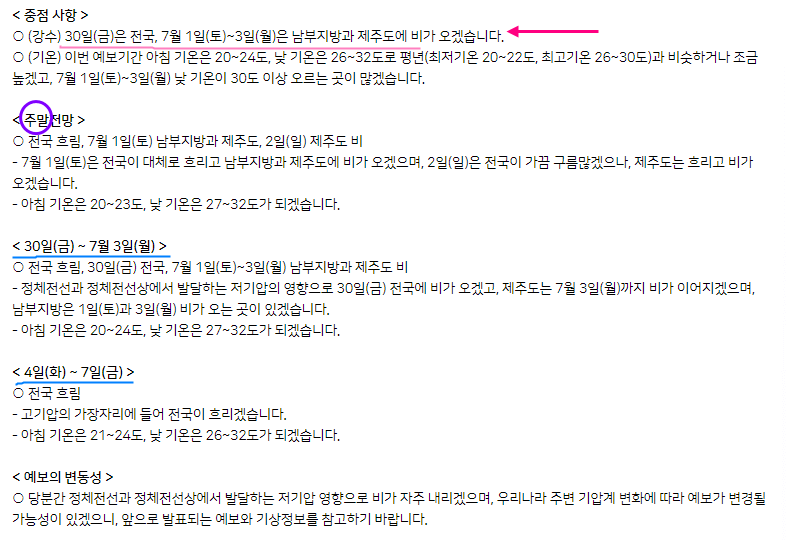 - 6월 30일 전국 비, 7월 1일~3일 남부지방과 제주도 비